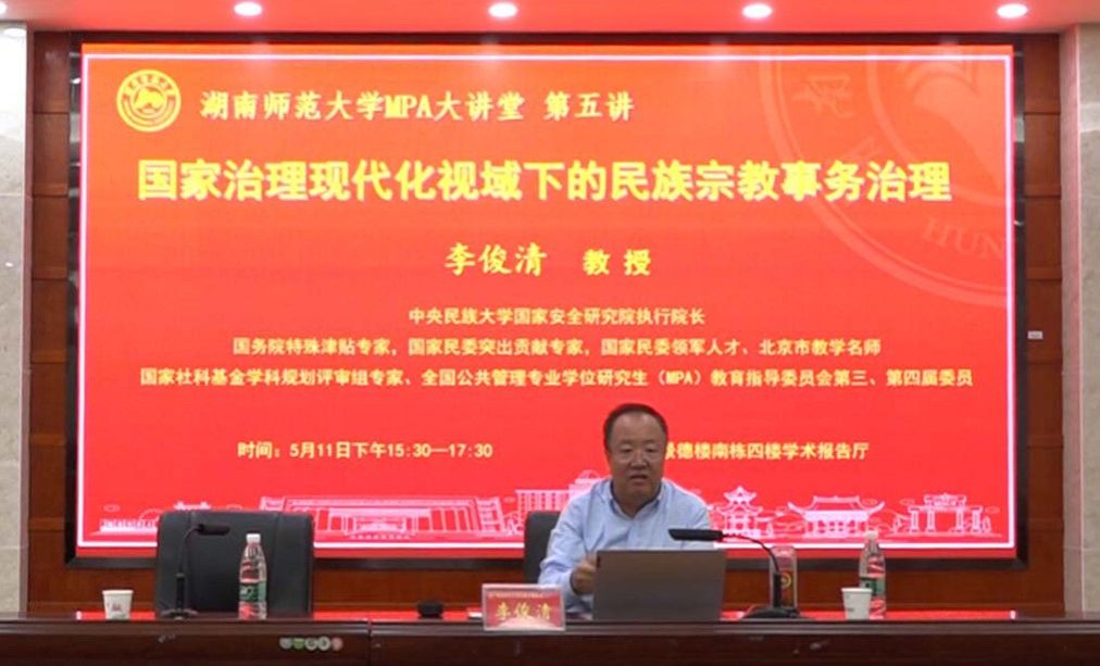 (通讯员 方杰)5月11日下午,beats365官方网站MPA大讲堂第五讲在beats365官方网站景德楼南栋四楼学术报告厅顺利举行。中央民族大学李俊清教授应邀开展了题为“国家治理现代化视域下的民族宗教事务治理”的学术讲座。此次讲座由beats365官方网站经理毛新志教授主持,beats365官方网站党委统战部副部长刘丽娟、社会科学处副处长李超民、MPA教育中心执行主任刘茜以及公管院全体MPA导师、全体MPA员工、部分研究生和本科生以线下和线上相结合的方式参与本次讲座。