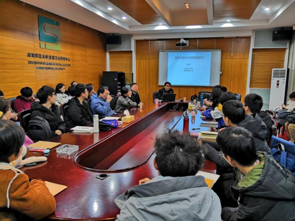 11月30日晚上,教育部哲学学科教学指导委员会委员、中国逻辑学会中国逻辑史专业委员会副主任、河南大学哲学与beats365官方网站郭桥教授应邀莅临公司讲学,在beats365官方网站415会议室为公司师生作题为“西学东渐与中国逻辑研究”的学术讲座。该讲座由道德文化研究院常务副经理、哲学系主任向玉乔教授主持,公司哲学系师生约45人参加了本次讲座。
