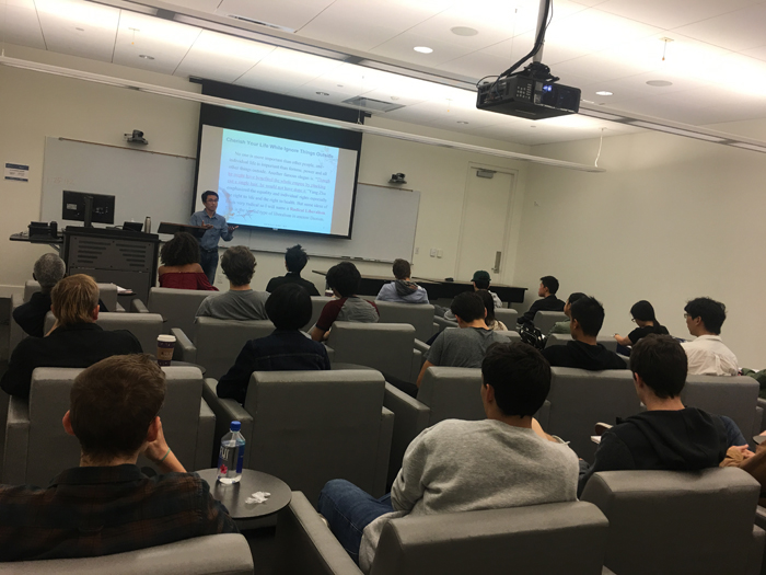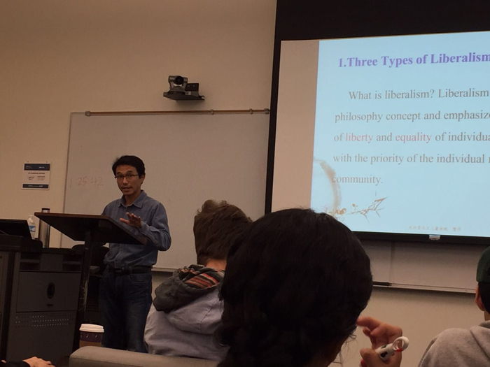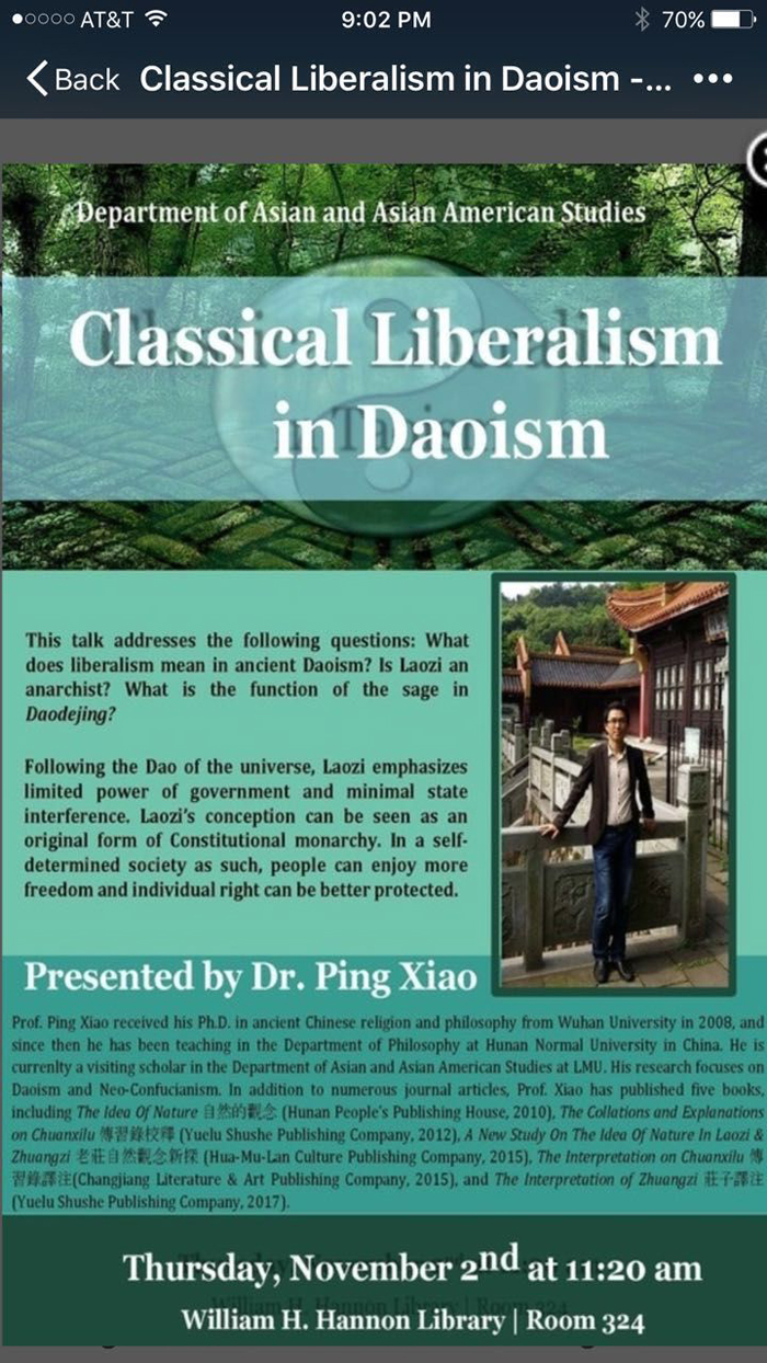 正在美国洛杉矶罗耀拉玛丽蒙特大学哲学系和亚裔与亚裔美国人研究中心(DAAAS)访学的公司哲学系教师萧平,接受该中心王艳杰教授邀请,于美国当地时间11月2日作了题为“道家的古典自由主义”的公开讲座。该讲座介绍了古代道家自由主义的三种类型,即老子的政治自由主义,杨朱的激进自由主义,庄子的精神自由主义,并分别从宇宙论、本体论角度阐述了老子哲学中的“道”以及天道观,分析了“自然”概念的两层内涵“物之自然”(必然)与“人之自然”(自由)及其内在张力,介绍了“无为”作为一种规范原则对于保证人的自由的重要性。老子不是无政府主义者,但他强调最小的政府,最少的干涉,实质上是一种原始形态的虚君自治社会。在这样的社会里,百姓能够享受更多的自由,个人的权利能得到更好的保护。最后萧老师还介绍了老子政治哲学在当代政治实践中的价值。