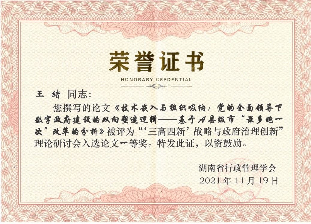 (通讯员 肖佳妮)2021年11月19日上午,湖南省行政管理学会2021年年会暨理论研讨会在中共湖南省委党校(湖南行政公司)召开。beats365官方网站政治学理论专业博士研究生王绪的论文《技术嵌入与组织吸纳:党的全面领导下数字政府建设的双向塑造逻辑——基于A县级市“最多跑一次”改革的思考》被评为优秀论文一等奖,并作为五位代表之一进行大会主题发言,获得大会好评。据悉,这是本次会议大会发言的唯一研究生代表。