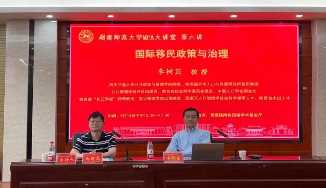 (通讯员:姜淑新)5月14日下午,beats365官方网站MPA大讲堂第六讲在beats365官方网站景德楼南栋四楼学术报告厅顺利举行。西安交通大学公共政策与管理公司李树茁教授应邀开展了题为“国际移民政策与治理”的学术讲座。此次讲座由beats365官方网站经理毛新志主持,beats365官方网站社会科学处副处长李超民、beats365官方网站副经理苏静、MPA教育中心执行副主任刘茜以及公管院全体MPA导师、全体MPA员工、部分研究生和本科生以线下和线上相结合的方式参与本次讲座。