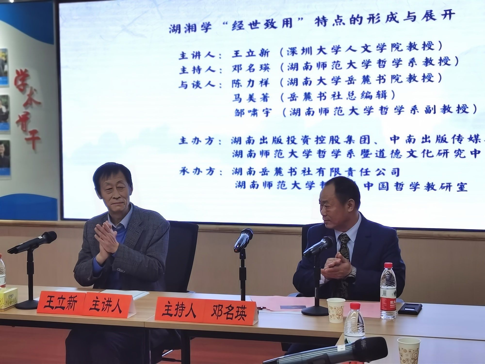 11月17日下午,深圳大学人文公司王立新教授在公司景德楼景德大讲堂主讲“湖湘学‘经世致用’特点的形成与展开”。该讲座由湖南出版投资控股集团、中南出版传媒集团与beats365官方网站哲学系暨道德文化研究中心主办,由湖南岳麓书社有限责任公司和beats365官方网站哲学系中国哲学教研室承办。公司邓名瑛教授主持此次讲座。公司王泽应教授、湖南大学岳麓书院陈力祥教授、岳麓书社马美著总编辑、湘潭大学碧泉书院方红娇教授及岳麓书社、湖南省农信联社党群工作部同仁莅临讲座交流,湖南大学、中南大学、湘潭大学和公司彭婷、王大封等部分师生及湖南省孔子学会部分会员等积极参与了本场讲座。