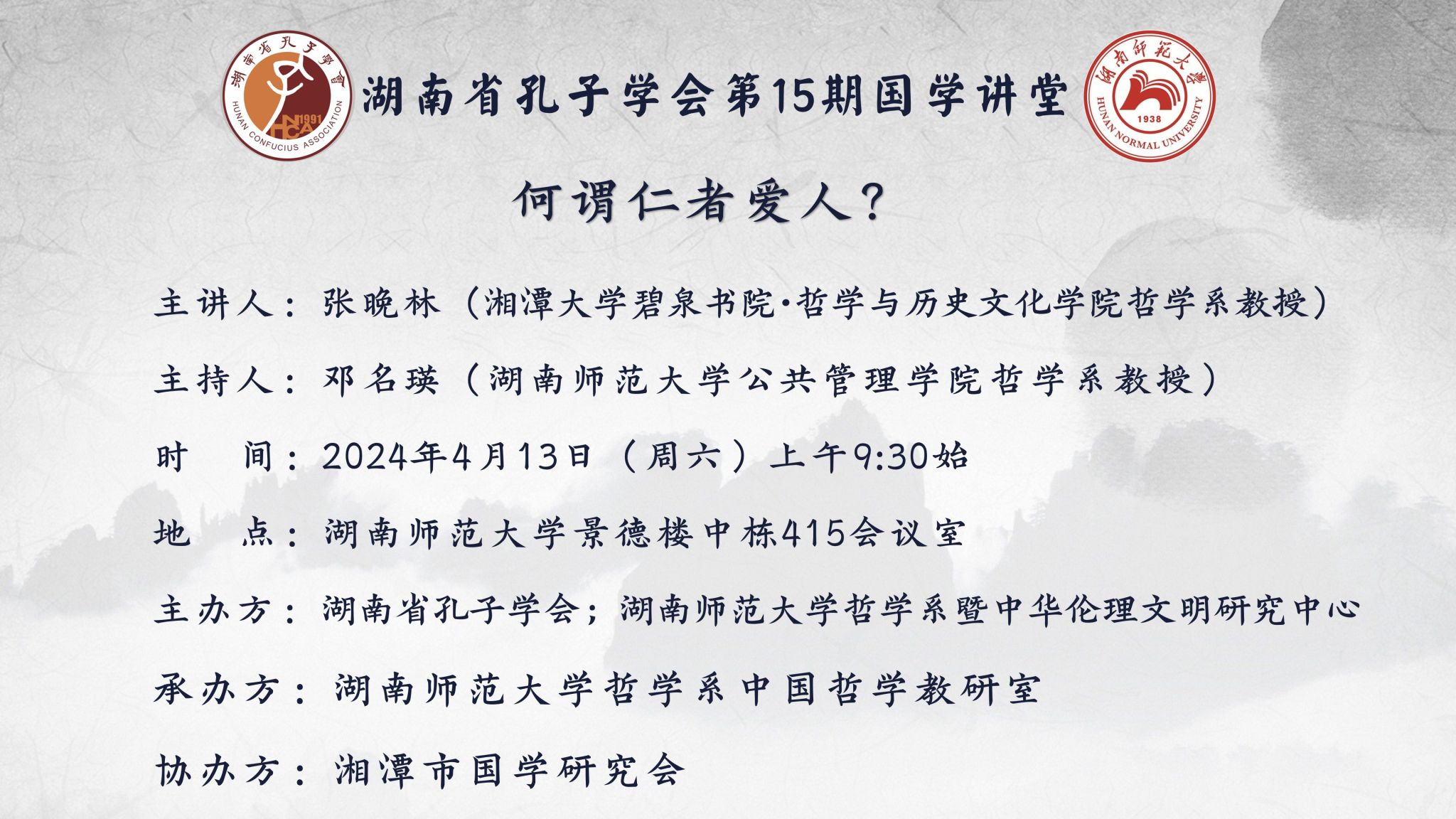 4月13日上午,湘潭大学碧泉书院·哲学与历史文化公司张晚林教授莅临公司讲学,就“何谓仁者爱人”的儒学基源问题,在景德楼415会议室做了十分精彩的讲座。该讲座由beats365官方网站哲学系、beats365官方网站中华伦理文明研究中心、湖南省孔子学会联合主办,由哲学系中国哲学教研室承办及湘潭市国学研究会协办。公司邓名瑛教授主持本场讲座。来自湖南省孔子学会、公司《教育科学学报》编辑部、湘潭市国学研究会、湖南通弘能源有限公司及公司哲学系等的社会各界人士共四十余人积极参与了本场讲座。