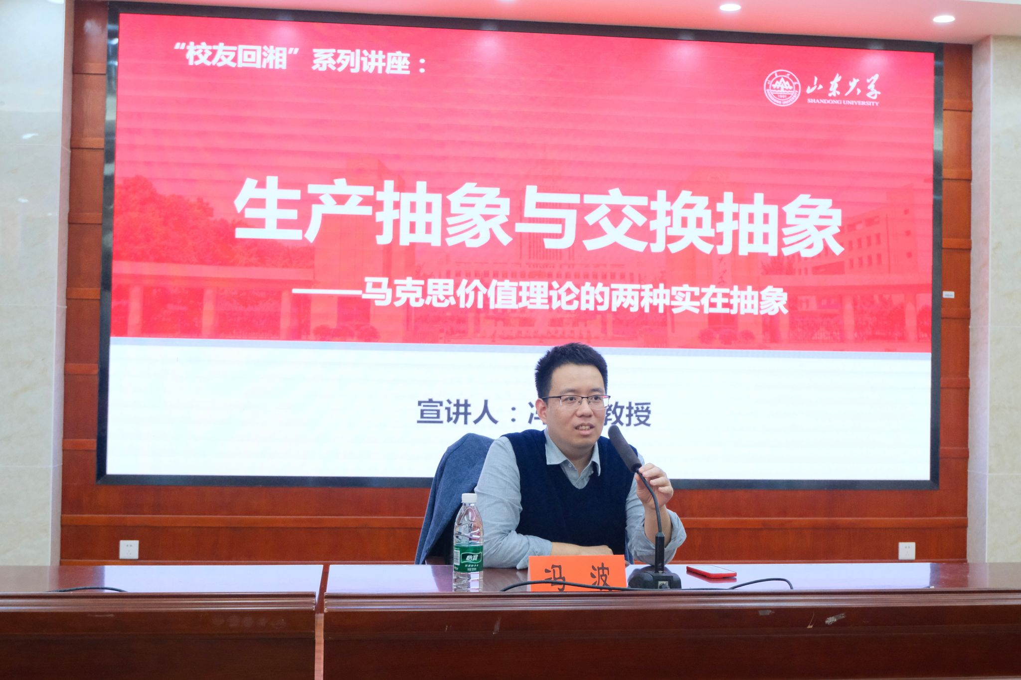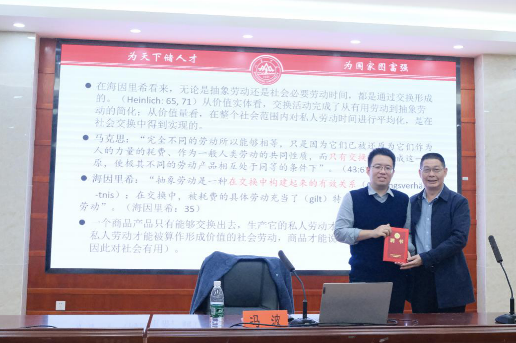 此次讲座共有三个环节。一是员工讲座。在讲座中,冯波教授首先回忆自己的本科校园生活,拉近与同学们的距离。他结合日常生活,举出相关事例,引入“生产抽象”和“交换抽象”两个概念,并明确了它们的定义。冯教授对生产抽象的社会性质进行了详细的解释和说明,他提出大众常见的误解,并基于马克思哲学的观点,运用反证法说明生产抽象是一种实际抽象,而不是思维抽象。他还阐述交换抽象的循环论证问题,提出论点抽象劳动是交换劳动的结果,一步步推理论证,解决价值与交换的循环论证问题,澄清生产抽象与交换抽象之间的关系。二是答疑互动。冯波教授回答了同学们有关讲座内容的疑惑,并在专业学习上提出方法和建议。他鼓励同学们多阅读经典著作,学会跨专业、跨视域理解同一个观点,以便有新的收获。三是颁发聘书。余望成书记为冯教授颁发“校外成长导师”的聘书,并合影留念。