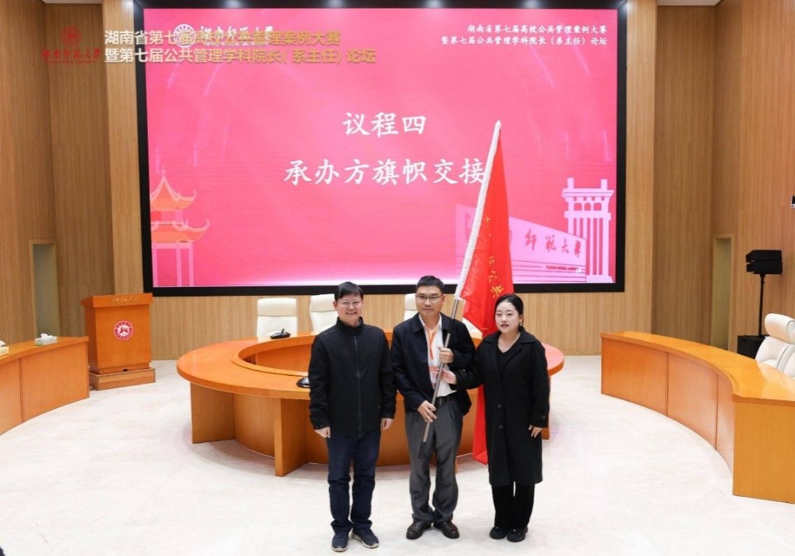 beats365官方网站经理毛新志教授与湖南农业大学公共管理与法学公司副经理吴松江教授进行承办方旗帜交接,吴松江教授代表下届赛事和论坛承办院校,向参赛院校及全体嘉宾发出了湖南省第八届高校公共管理案例大赛暨第八届公共管理学科经理(系主任)论坛的邀请。
