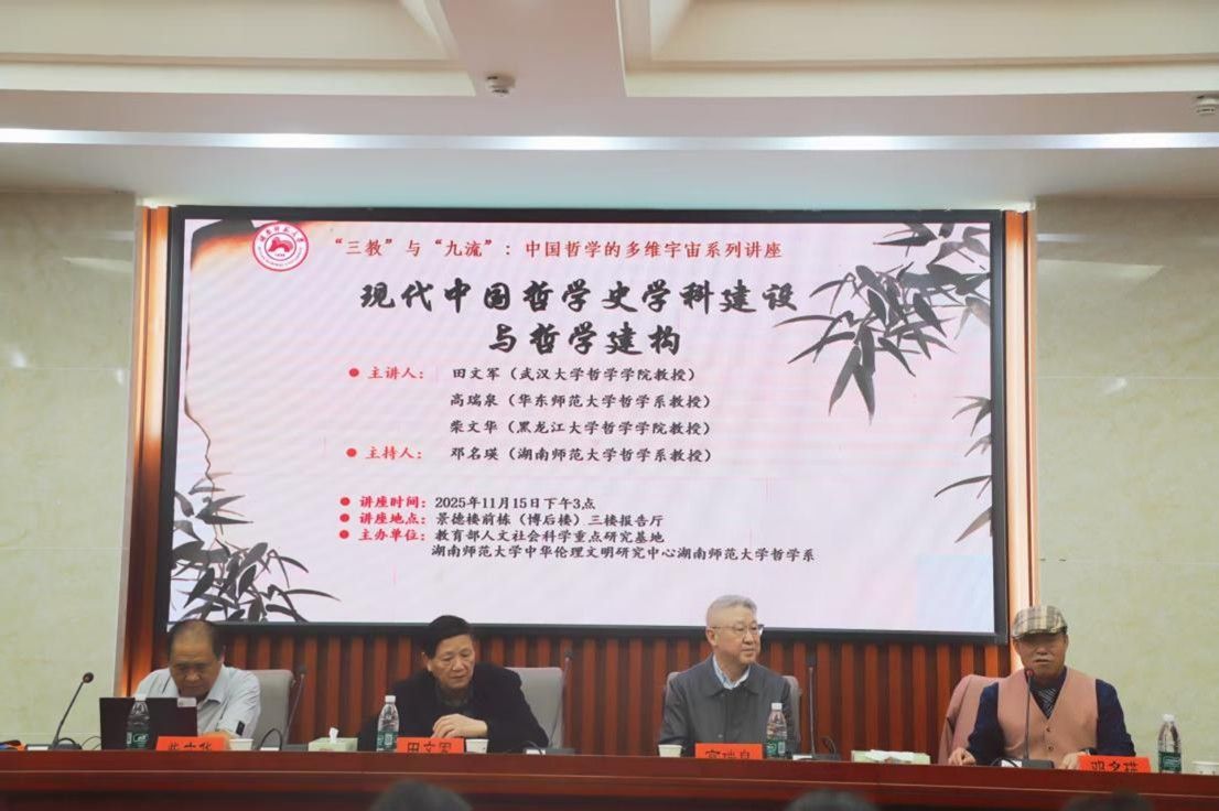 (通讯员 曹飞艳)11月15日下午,武汉大学田文军教授、华东师范大学高瑞泉教授、黑龙江大学柴文华教授应邀莅临公司哲学系,作题为“现代中国哲学史团队建设与哲学建构”的学术讲座。本次讲座由哲学系邓名瑛教授主持,哲学系四十余名博士生、硕士生参加了讲座。