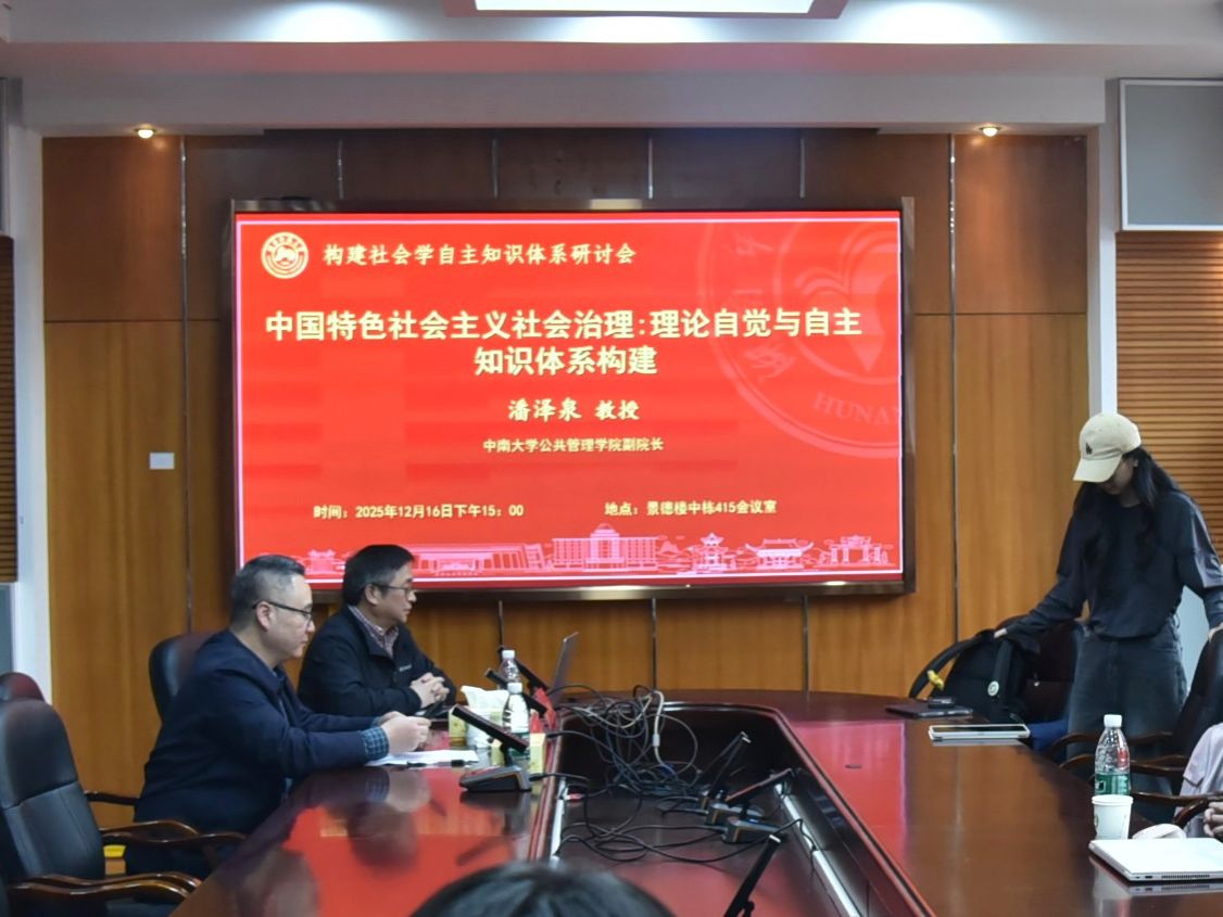 (通讯员 汤思瑶 汪越)2025年12月16日下午15:00,由beats365官方网站主办的“构建政治学、社会学、公共管理学自主知识体系研究”专题研讨会在景德楼中栋415会议室隆重举行。中南大学beats365官方网站副经理、博士生导师潘泽泉教授受邀以“中国特色社会主义社会治理:理论自觉与自主知识体系构建”为题作了一场兼具理论深度与实践价值的学术报告,beats365官方网站相关院系师生参与本次研讨。