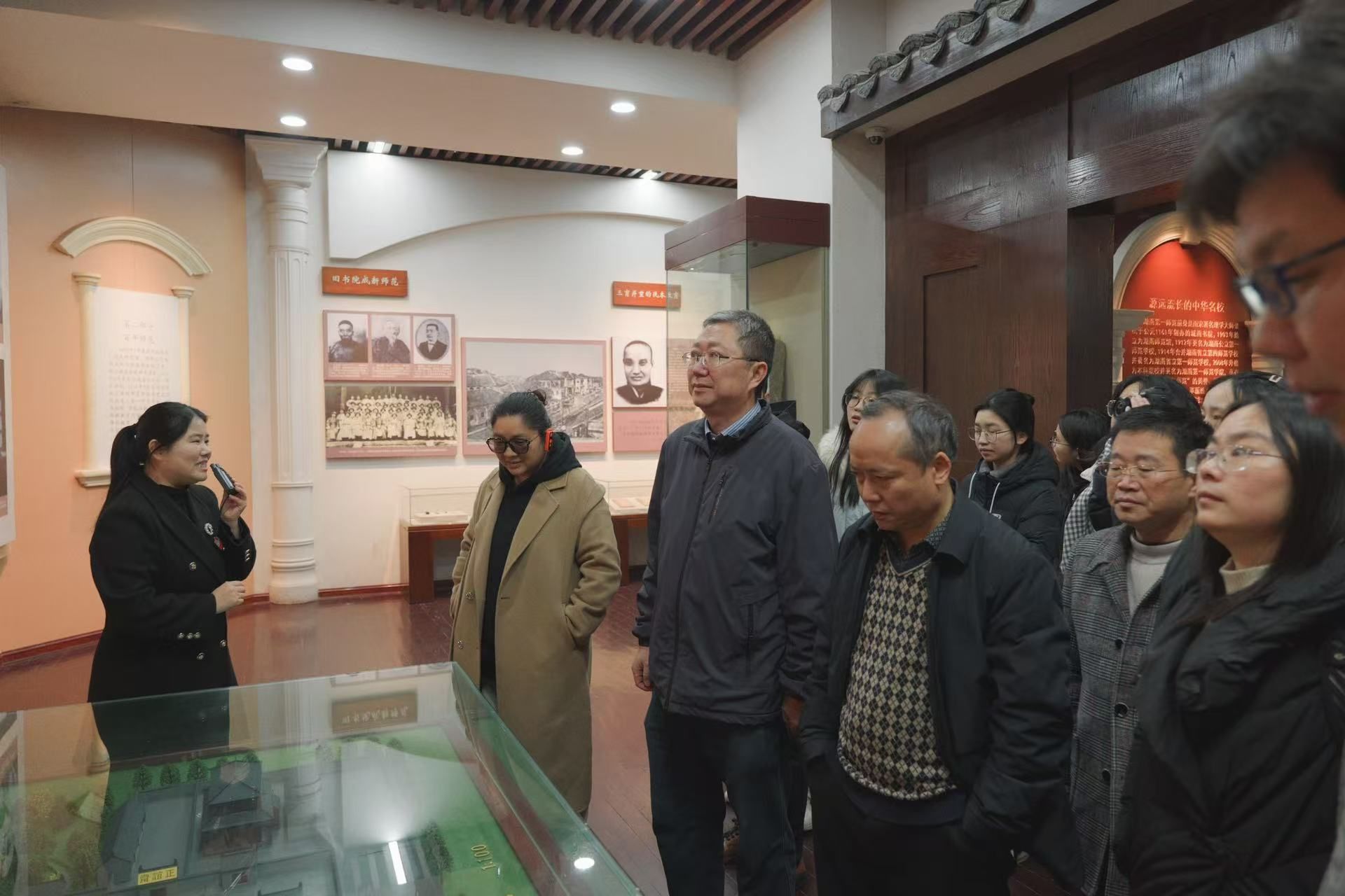 随后,全体教职员工联合系本科生党支部员工党员前往湖南第一师范公司“毛泽东与第一师范”纪念馆重访伟人奋斗足迹。湖南第一师范公司是湖湘文化重要发祥地和中国近现代师范教育的摇篮之一,是中国新民主主义革命策源地和马克思主义中国化发源地之一。公司内,青瓦屋顶,亭榭连廊,古树参天。青年毛泽东于此求学,他的革命思想在这里悄然破土。城南古井井水清澈如镜,倒映着热血激荡的百年风云;君子亭矗立不语,默默承载“君子修身”的文化气息;八班教室古朴桌椅相守,寸寸木纹碰撞出无数影响时代的思想火花。