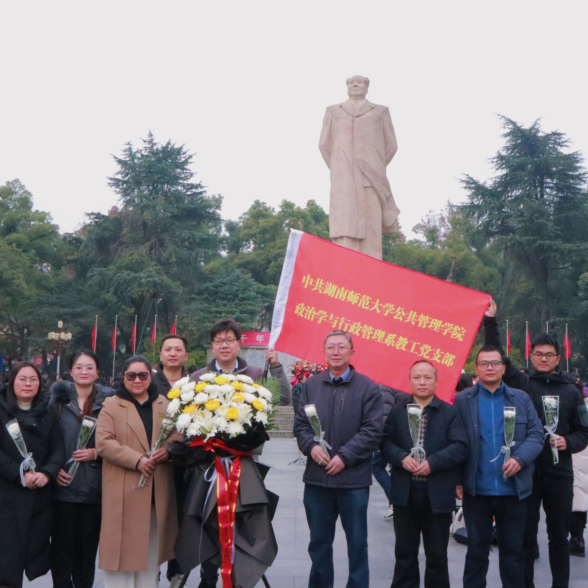 12月26日是中国共产党、中国人民解放军、中华人民共和国的主要缔造者,中国各族人民的伟大领袖毛泽东同志诞辰131周年纪念日。政治学与行政管理系教职员工首先前往长沙市岳麓区东方红广场瞻仰毛主席雕像并敬献花篮,以此表达对伟大领袖毛主席的深切怀念和无限敬仰。