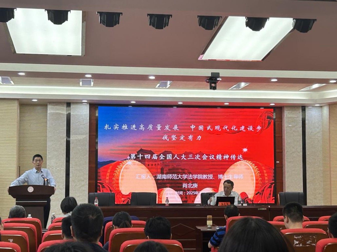 肖北庚教授全面介绍了“两会”盛况;传达了习近平总书记在“两会”期间发表的一系列重要讲话精神;深入解读了政府工作报告、全国人大常委会工作报告、“两高”报告,通过大量数据和案例阐释了全国“两会”释放出的新导向、新任务和新举措,特别是统筹推进教育、科技、人才体制机制一体改革的重要工作部署;分享了湖南代表团的履职情况和个人履职经历。