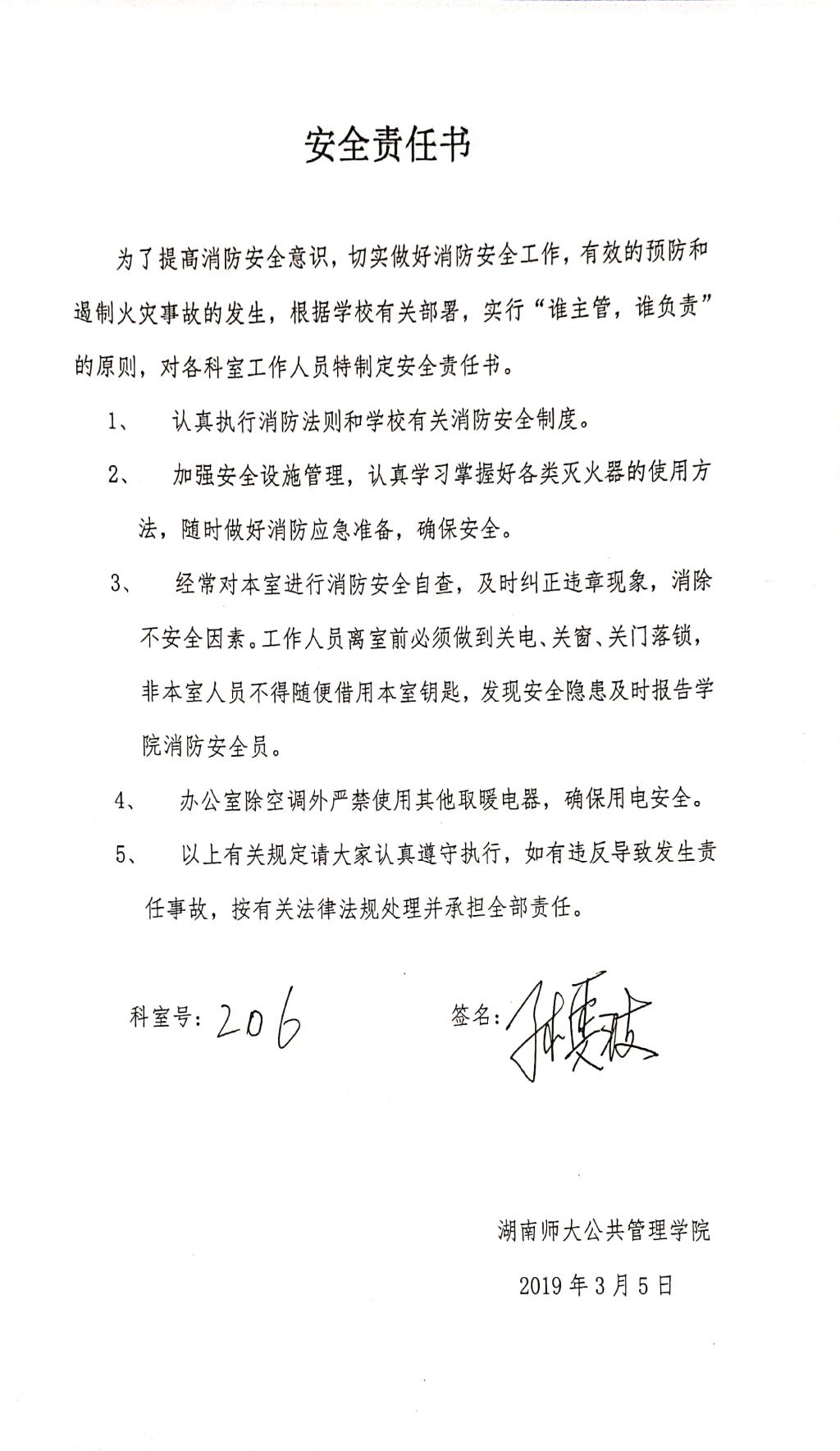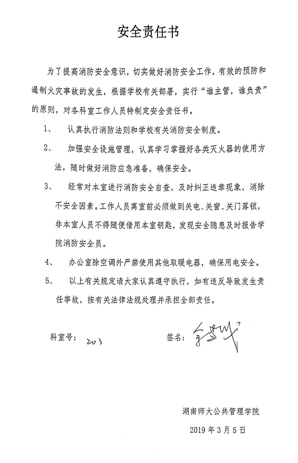 按照公司消防安全工作要求,各科室的工作人员均签订了安全责任书,承诺落实“谁主管,谁负责”的安全责任原则,自觉遵守劳动纪律和消防安全规章制度,严格执行操作规程和防火守则。