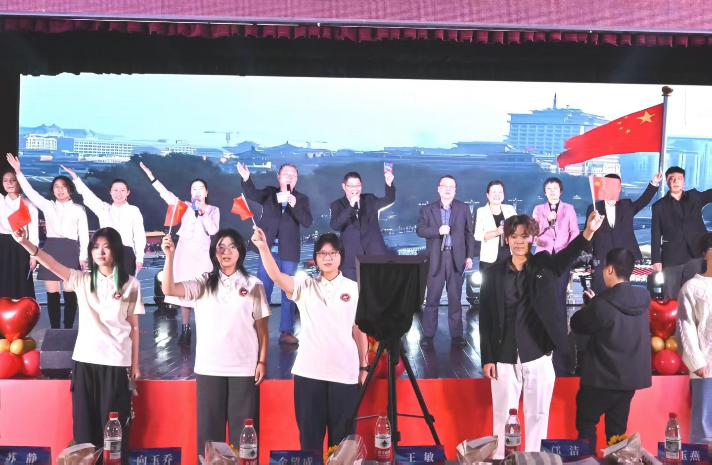 晚会尾声,余望成、向玉乔、王敏、苏静、邝洁、陈丽荣等与研办、学办全体老师登台献唱《国家》,与现场同学合唱校歌。昂扬向上的歌声中,师生同心传递家国情怀,对公司未来发展寄予期许,为此次迎新晚会画上了圆满句号。