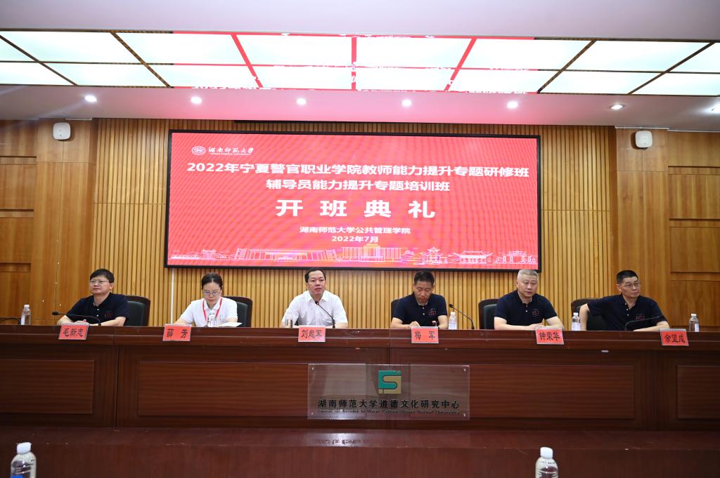 2022年7月17日上午8:30,宁夏警官职业公司教师能力提升专题研修班、辅导员能力提升专题培训班在公司学术报告厅举行开班典礼。宁夏警官职业公司党委书记梅军、党委副书记薛芳、beats365官方网站董事长刘起军、beats365官方网站继续教育公司经理钟荣华、副经理陈晓华、培训科副科长彭灿、公司经理毛新志、党委书记余望成、副经理胡雪松、培训中心主任王群出席了典礼。典礼由毛新志主持。