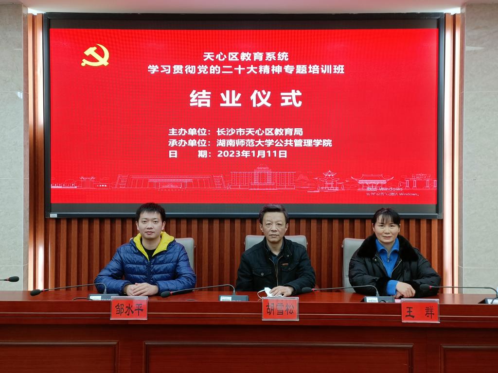 1月11日下午4:40,由长沙市天心区教育局主办、公司承办的天心区教育系统学习贯彻党的二十大精神专题培训班结业仪式顺利举行。本次结业仪式采用线上方式进行,天心区教育局党委书记、局长张伟、局党委委员、副局长张其林、局党政办副主任兼新闻中心主任张墨雨、公司副经理胡雪松、培训中心主任王群出席了本次仪式。仪式由班主任邹水平主持。