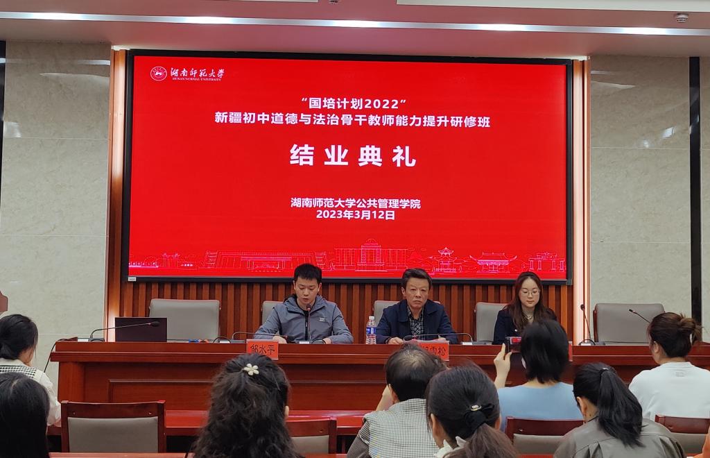 3月12日上午,由新疆维吾尔自治区教育厅主办、公司承办的“国培计划2022”—新疆初中道德与法治骨干教师能力提升研修班结业典礼在公司博后楼三楼报告厅顺利举行。公司副经理胡雪松、社会学系副教授王欣出席了本次典礼。典礼由班主任邹水平老师主持。