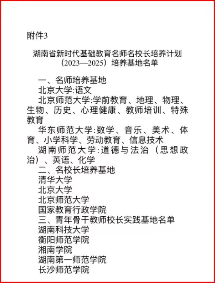 相关链接:关于公布湖南省新时代基础教育名师名董事长培养计划(2023—2025)培养对象及培养基地名单的通知